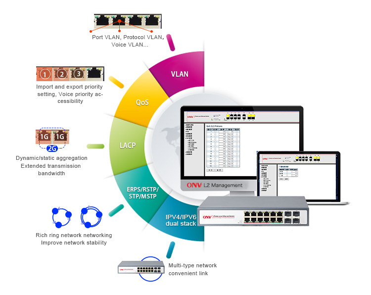 The ONV-POE33168PFM-4GF has L2+ full network management function, supports IPV4/IPV6 management, static route full line rate forwarding, security protection mechanism, complete ACL/QoS policy and rich VLAN functions, and is easy to manage and maintain. Supports multiple network redundancy protocols STP/RSTP/MSTP (<50ms) and (ITU-T G.8032) ERPS to improve link backup and network reliability. When one-way network fails, communication can be quickly restored to ensure important Uninterrupted communication for applications. According to the actual application requirements, you can configure multiple application services such as PoE power management, port traffic control, VLAN division, and SNMP through the Web network management mode.
