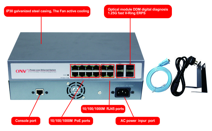 | ONV-POE33168PFM-4GF | L2+ managed PoE fiber switch with 12* 10/100/1000M RJ45 ports and 4*100/1000M SFP fiber slot ports , Port 1-8 can support IEEE 802.3af/at PoE standard, Built-in 130W power supply. Support 1U/19 inch rack installation. |