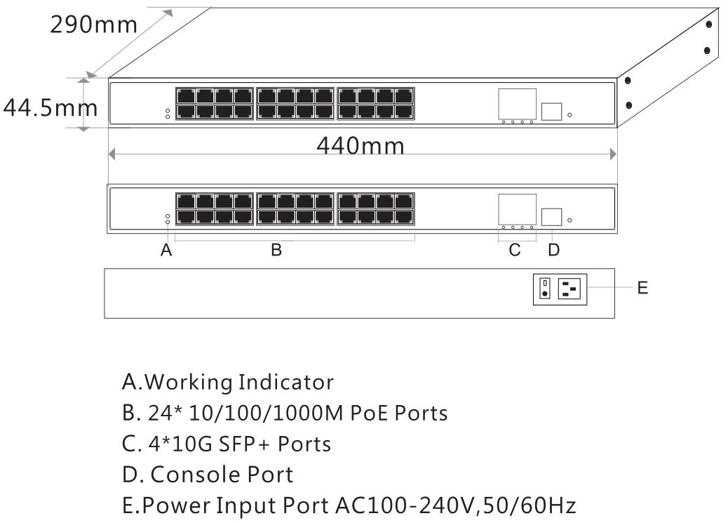 | Fixed Port | 24*10/100/1000Base-T PoE ports (Data/Power) 4*1/10G uplink SFP+ fiber slot ports (Data) 1*Console RS232 port (115200, N,8,1) | |