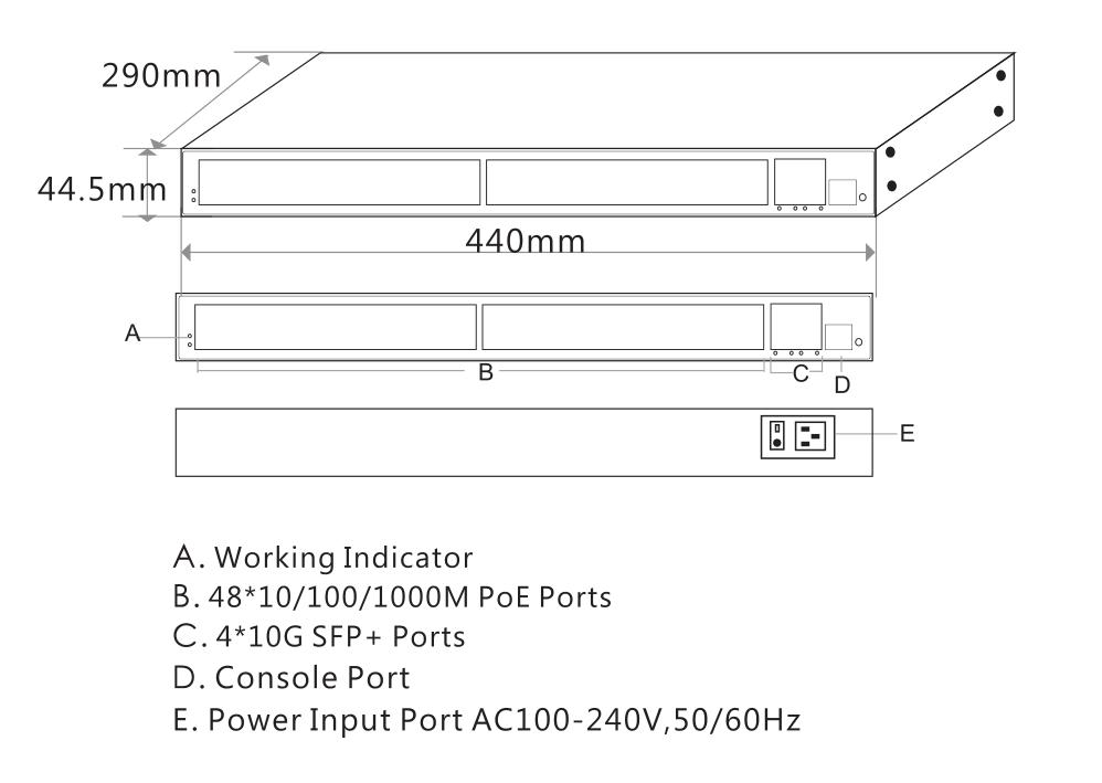 | Fixed Port | 48*10/100/1000Base-T PoE ports (Data/Power) 4*1/10G uplink SFP+ fiber slot ports (Data) 1*Console RS232 port (115200,N,8,1) |