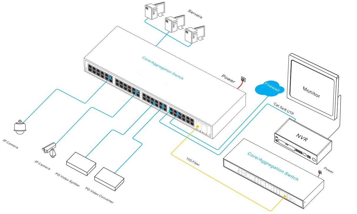 The ONV-POE36048PFM series is a 10G uplink managed PoE switch independently developed by ONV. It has 48*10/100/1000Base-T RJ45 ports and 4*1/10G SFP+ fiber slot ports. Port 1-48 can support IEEE802.3af/at standard PoE power supply. single port PoE power reaches 30W, and the maximum PoE output power is 600W. As a PoE power supply device, it can automatically detect and recognize the power receiving equipment that meets the standard and supply power through the network cable. It can supply power to POE terminal equipment such as wireless AP, webcam, VoIP phone, building visual access control intercom, etc. through network cable, to meet the network environment that needs high-density PoE power supply. It is suitable for hotel, campus, factory dormitory and small and medium-sized enterprise.