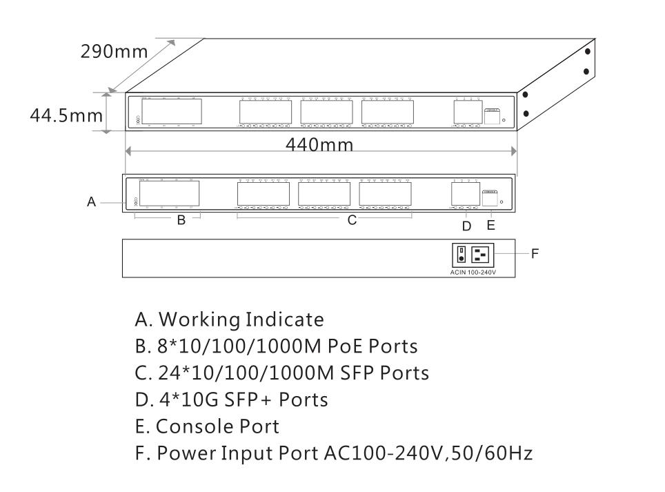 Fixed Port | 8*10/100/1000Base-T PoE ports (Data/Power) 24*100/1000Base-X uplink SFP fiber slot ports (Data) 4*1/10G uplink SFP+ fiber slot ports (Data) 1*Console RS232 port (115200,N,8,1) | |