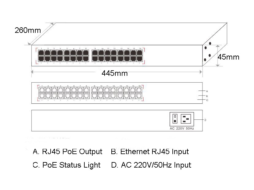 | Port Description | 1x AC input port 16*10/100M PoE ports 32*10/100M RJ45 ports | |