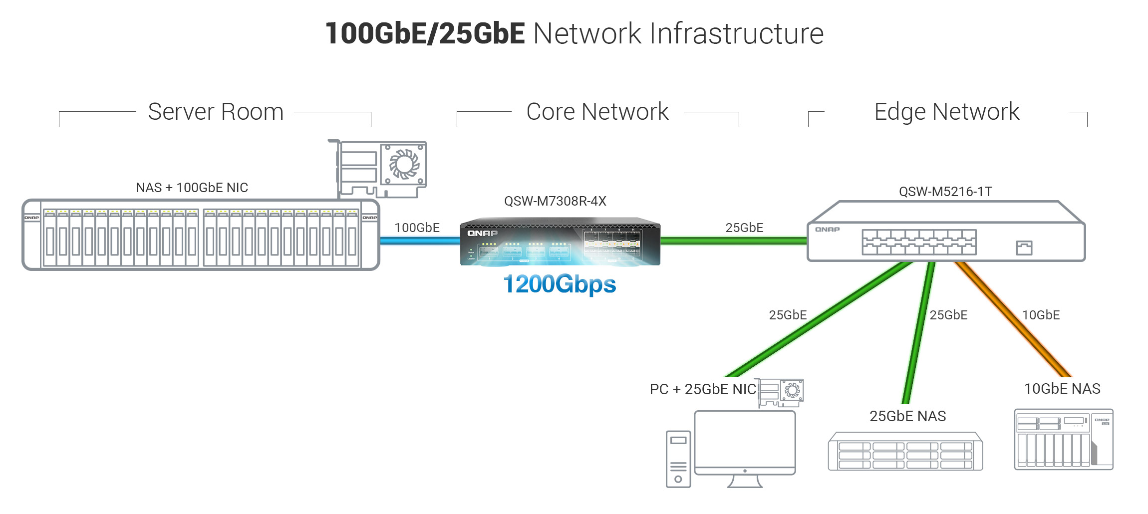 Tăng cường hiệu suất và năng suất IT của bạn bằng cách sử dụng QXG-100G2SF-BCM kết hợp với switch 100GbE QSW-M7308R-4X của QNAP — giải pháp giúp triển khai hạ tầng mạng 100GbE siêu tốc cho doanh nghiệp dễ dàng hơn bao giờ hết.