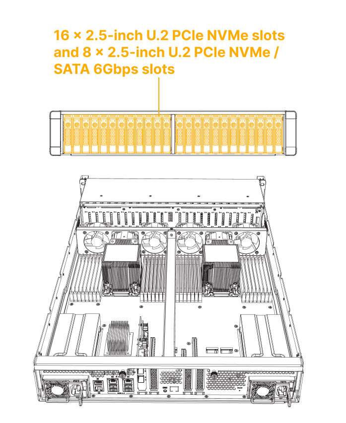 Cấu hình All-Flash NVMe: Thiết bị cung cấp 24 khay ổ đĩa 2.5-inch, bao gồm 16 x U.2 PCIe NVMe chuyên dụng và 8 x U.2 PCIe NVMe/SATA 6Gbps, mang lại thông lượng và IOPS vượt trội.
