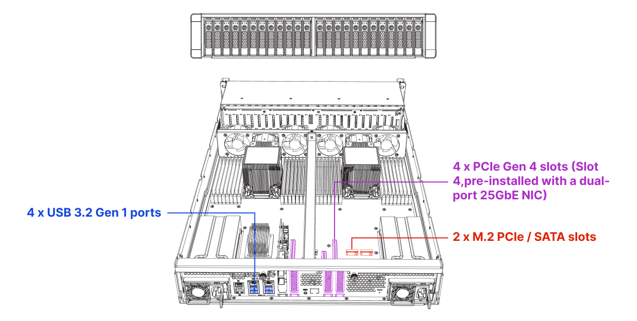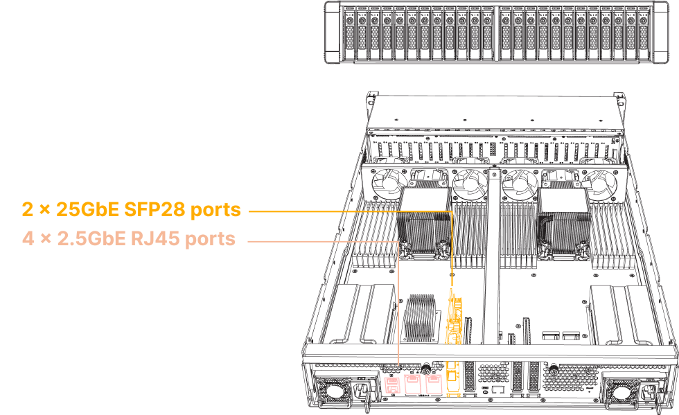Kết nối mạng Tốc độ cực cao: Tích hợp sẵn 2 cổng 25GbE SFP28 SmartNIC (PCIe) và 4 cổng 2.5GbE.